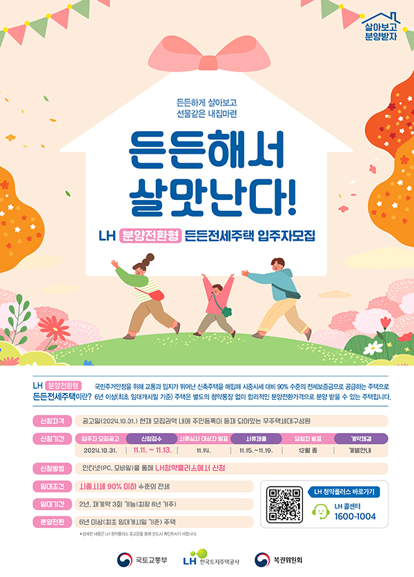 분양전환형 매입임대주택은 합리적인 임대료와 분양 기회를 제공하여 임차인의 주거 부담을 덜어주고, 6년 후 안정된 주거지에서 내 집 마련을 실현할 수 있는 기회를 제공합니다. 이번 입주자 모집은 10월 31일부터 시작되며, 자세한 사항은 LH 청약플러스 웹사이트에서 확인 가능합니다.