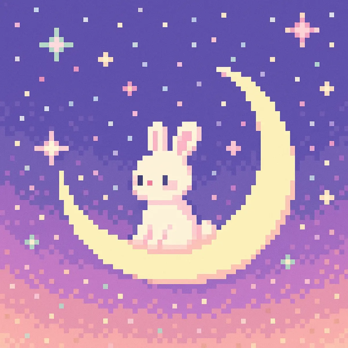 • Cute pixel art of a starry night with a small rabbit on the moon, 80s retro vibe, pastel colors