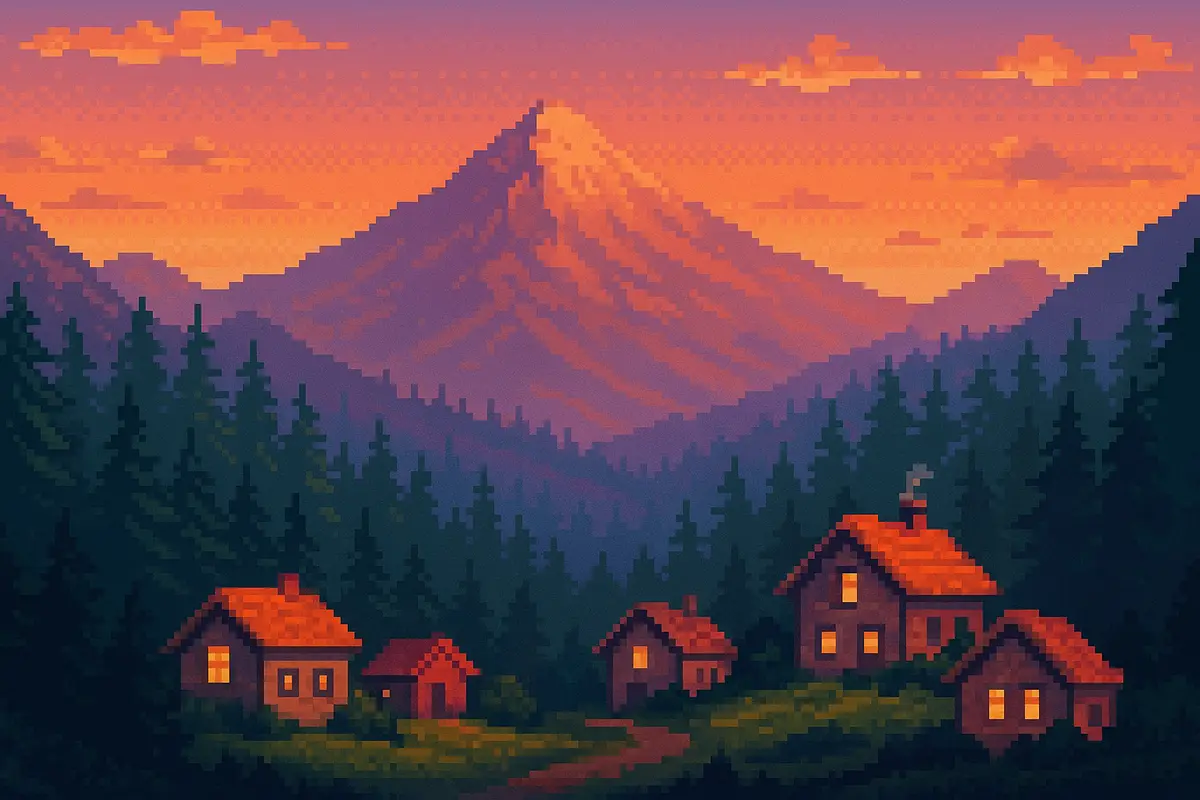 • Pixel art of a peaceful mountain village at sunset, 16-bit SNES style, with pine trees and small houses